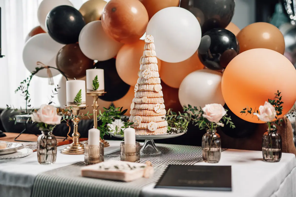 Hver hringur er síðan sprautaður með glassúr sem festir hringina saman og allra síðast er kakan skreytt með súkkulaðiskrauti.