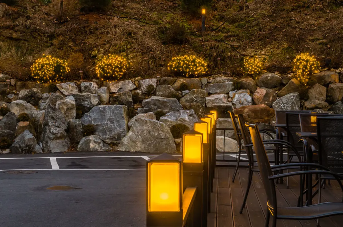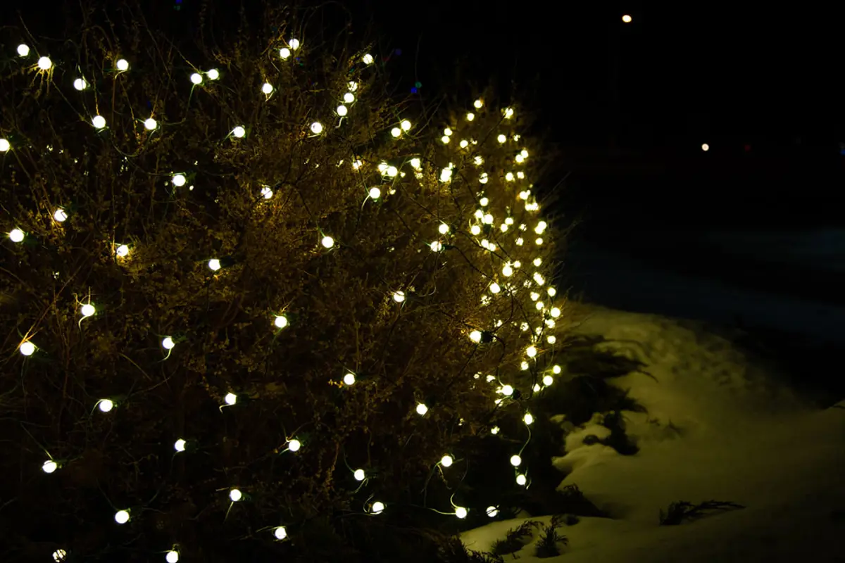 Fallegt er að hafa sígræna runna í pottum við innganginn og ekki dregur úr fegurðinni og hlýunni séu runnarnir skreyttir ljósum í skammdeginum hvort sem það er hvítt eða rautt.